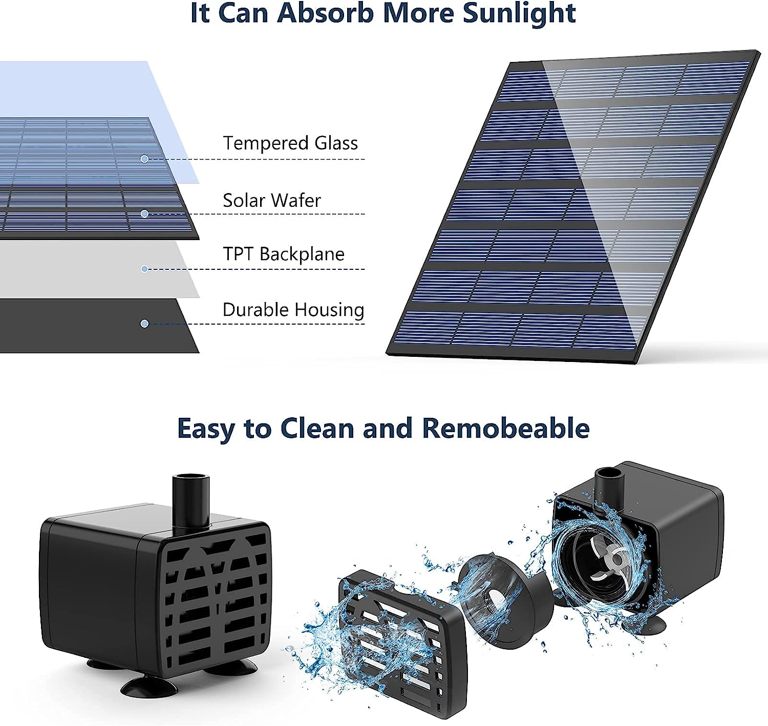 - [✔Eco-friendly And Safe]: It does not need batteries or electricity, it is completely controlled by solar energy. So, it is very environmentally friendly. This solar water pump kit is very safe from users without any danger. It is a perfect patio and garden decoration.